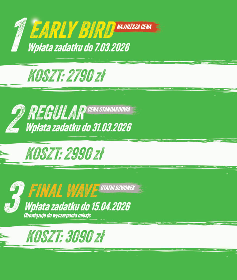 Cena uczestnictwa w obozie uzależniona jest od daty wykonania przelewu zadatku na konto obozowe i obowiązuje w ramach progów cenowych.